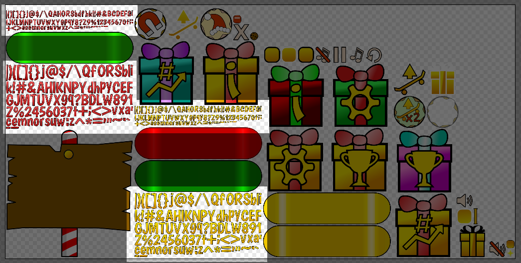 Following that advice, I packed up all of my UI layer graphics, fonts, and particles into a single texture atlas.